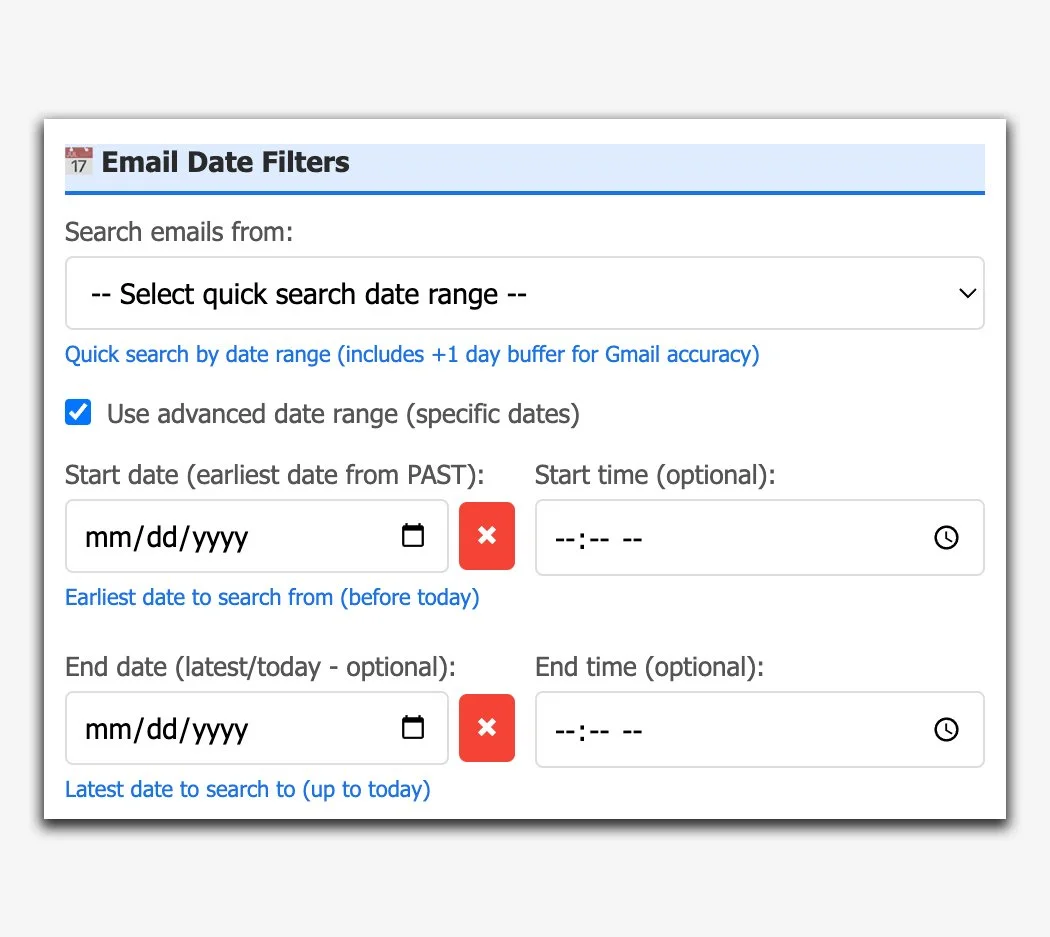 Use the quick-search date option for rapid turnaround tasks. Use the advance date range selectors for a much broader sweep!