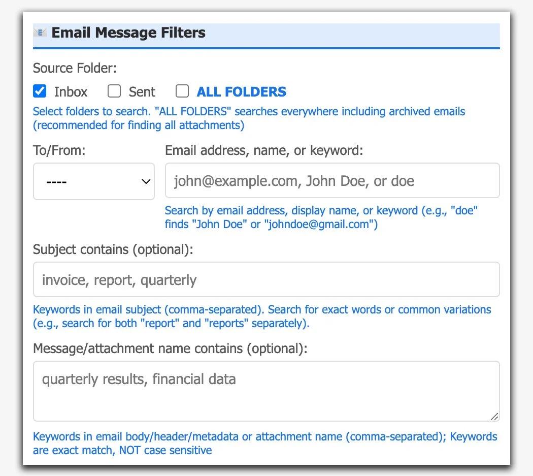 Search all of your mail folders for any attachments, even those pesky ones that aren’t in your Inbox but that show up in Gmail’s search! Filter on emails sent to someone else but where you were on the cc/bcc list.